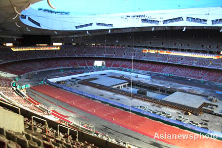 An interior view of Beijing's National Stadium with new red floor covering on the track in this photo taken April 1, 2008. The stadium, which will host the opening and closing ceremonies as well as the athletics events during this summer's Olympics, is almost ready for testing next month. [Asianewsphoto]