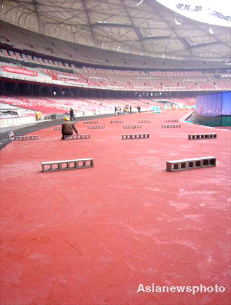 Workers check the new red floor covering inside Beijing's National Stadium, also known as the Bird's Nest, April 1, 2008. The stadium, which will host the opening and closing ceremonies as well as the athletics events during this summer's Olympics, is almost ready for testing next month. [Asianewsphoto]