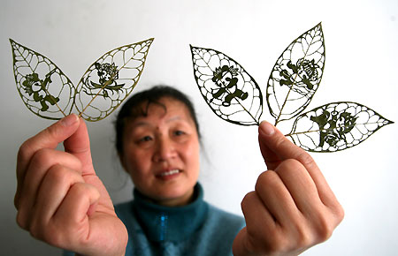 Paper-cutting artist Du Wanli holds up her creations carved out of leaves featuring the five Fuwas, the mascots for the Beijing Olympic Games, in her home in Jinan, capital of East China's Shandong Province, March 3, 2008. Du spent more than two months finishing the artwork, expressing her best wishes for the upcoming Beijing Olympic Games. [Xinhua]