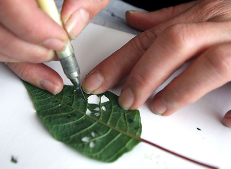 Paper-cutting artist Du Wanli cuts out parts of a leaf to create her artwork in her home in Jinan, capital of East China's Shandong Province, March 3, 2008. Du spent more than two months finishing the artworks carved out of leaves, expressing her best wishes for the upcoming Beijing Olympic Games. [Xinhua]
