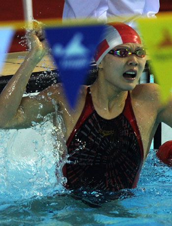 Zhao Jing celebrates after she set up a new Asian record with 59.81 seconds in the women's 100 meters backstroke at the seven-day Olympic test event, in Shao Xing of East China, March 4, 2008. [Xinhua]