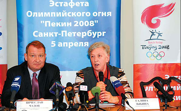 Vyacheslav Chazov (left), head of the St. Petersburg sports and physical culture committee, and torchbearer Galina Zybina attend a press conference on Friday. The Olympic flame arrived in St. Petersburg on Friday for the third leg of its global journey. [Xinhua]