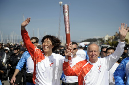 Torchbearer Lang Ping (L), the US women's volleyball team coach, and another torchbearer hold the torch while running in San Francisco, the United States, April 9, 2008. San Francisco is the sixth stop of the 2008 Beijing Olympic Games torch relay outside the Chinese mainland. [Xinhua]