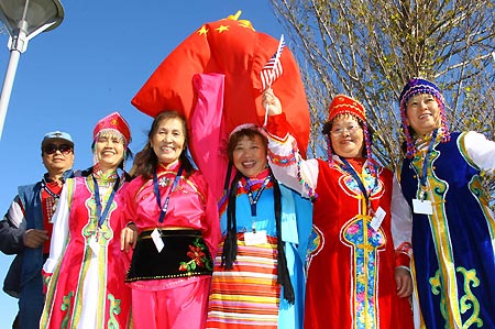 People wait to welcome the Olympic flame before the beginning of the Olympic torch relay in San Francisco, the United States, April 9, 2008. San Francisco is the sixth stop of the 2008 Beijing Olympic Games torch relay outside the Chinese mainland. [Xinhua]