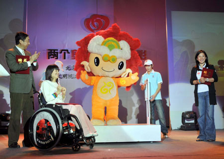 Former gymnast Sang Lan, who is paralyzed from the chest down after an accident during a vault warm-up in 1998, attends a ceremony officially launching the lion mascot Dong Dong for the Beijing Olympic and Paralympic cheerleaders, in Beijing, April 10, 2008. [Xinhua]