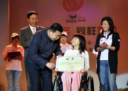 Former gymnast Sang Lan, who is paralyzed from the chest down after an accident during a vault warm-up in 1998, holds a Letter of Appointment as captain of cheerleaders for the Beijing Olympic and Paralympic Games at ceremony officially launching the cheerleaders' uniform and mascot, in Beijing, April 10, 2008. [Xinhua]