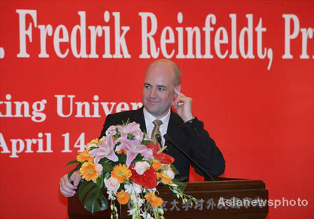 Swedish Prime Minister Fredrik Reinfeldt delivers a speech at Peking University, April 14, 2008. [Asianewsphoto] |