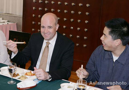 Swedish Prime Minister Fredrik Reinfeldt has a lunch with college students at Peking University in Beijing, April 14, 2008. [Asianewsphoto]