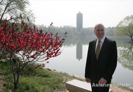 Swedish Prime Minister Fredrik Reinfeldt poses for a photo in front of the Weiming Lake at Peking University in Beijinga, Ainpril 14, 2008. [Asianewsphoto]