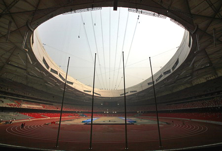 Flag poles can be seen next to the track at the National Stadium, also known as the Bird's Nest, in Beijing April 16, 2008. The stadium will host the Good Luck Beijing Race Walking Challenge on Thursday, the first event to be held at the 2008 Beijing Olympic Games athletics stadium. [Agencies]