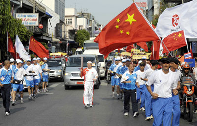 A torchbearer runs with the torch for the Beijijing Olympic Games in Bangkok, capital of Thailand, on April 19, 2008. Bangkok leg, the 12th stop of the 2008 Beijing Olympic Games torch relay outside the Chinese mainland, concluded successfully Saturday. [Xinhua]
