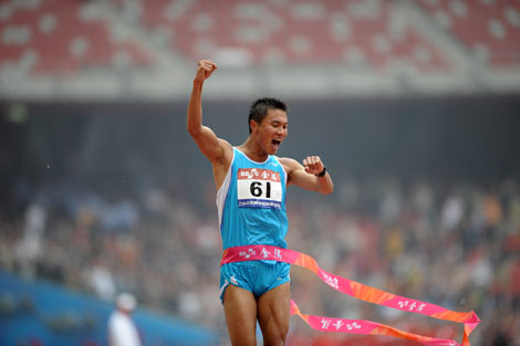 Chinese Si Tianfeng crosses the finish line to win the Good Luck Beijing 50km IAAF Race Walking Challenge at the National Stadium, also known as "Bird's Nest", in Beijing, April 19, 2008. [Xinhua]