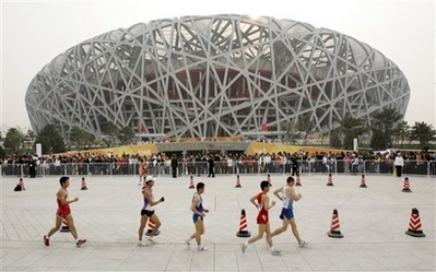 Racers pass by the National Stadium, also known as the Bird's Nest during the Good Luck Beijing 50km IAAF Race Walking Challenge, Saturday, April 19, 2008, in Beijing. [Agencies]