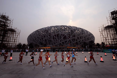 Athletes compete in the men's 50km IAAF Race Walking Challenge outside the National Stadium, also known as the "Birds Nest", in Beijing, April 19, 2008. Chinese Si Tianfeng won the race. [Xinhua]