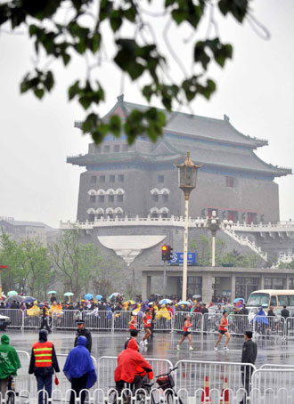 Spectators watch the Good Luck Beijing 2008 Marathon in Qianmen Street on raining Sunday morning. The race started from Tian'anmen Square at 7:30 am on Sunday and ended at the "Bird's Nest". [Agencies]