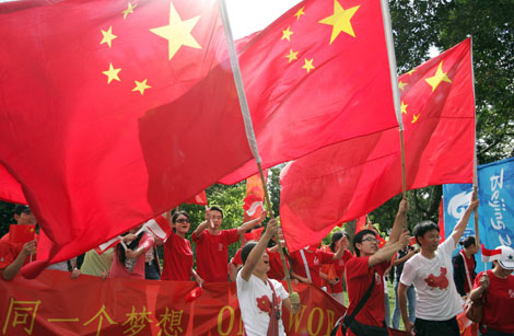 Overseas Chinese people wave Chinese national flags to celebrate the Beijing Olympic torch relay near the Senayan Stadium in Jakarta April 22, 2008. [Agencies] |