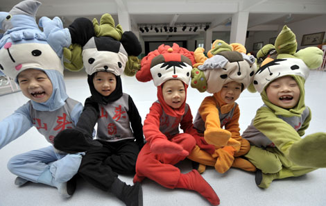 The Lin quintuplets dressed as Fuwas, the mascots for the Beijing Olympic Games, pose for the camera in a kindergarten classroom in Shantou, Guangdong Province, April 24, 2008. The five 6-year-olds will take part in the opening ceremony for the Beijing Olympic torch relay in the city, which will begin on May 10, 2008. [Xinhua] |