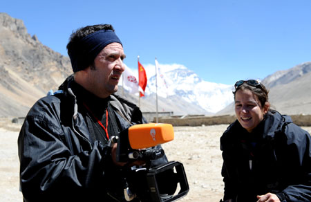 A German journalist (L) looks from an observation point at Mt. Qomolangma, also known as Mt. Everest in the West, April 28, 2008. Thirty reporters, including 11 foreigners, reached the Mt. Qomolangma media center Monday for covering the ascent of the Beijing Olympic flame to the world's highest peak. [Xinhua]