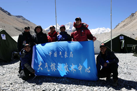 China Meteorological Administration staff members pose for a group photo at the the 5,040-meter-high base camp of Mt. Qomolangma, or Mt. Everest known in the West, April 29, 2008. The precise date of the ascent of the Beijing Olympic flame to the world's highest peak will be decided by the weather conditions. [Xinhua] |