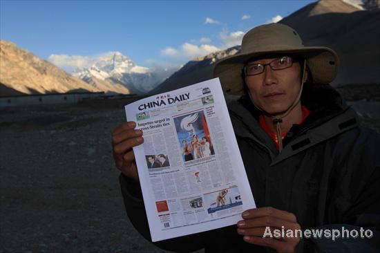 Zhang Hongjiang, a stringer for China Daily, poses for a photo with an issue of China Daily newspaper of April 30 in his hands at the Qomolangma Base Camp Wednesday April 30, 2008, 100 days before the opening of the 2008 Beijing Olympics. [Asianewsphoto]