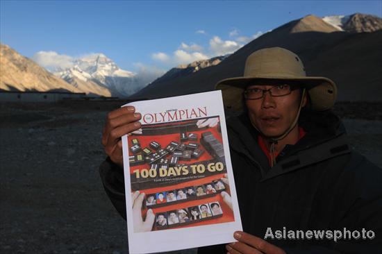 Zhang Hongjiang, a stringer for China Daily, poses for a photo with an issue of Olympian of April 30 in his hands at the Qomolangma Base Camp Wednesday April 30, 2008, 100 days before the opening of the 2008 Beijing Olympics. [Asianewsphoto]