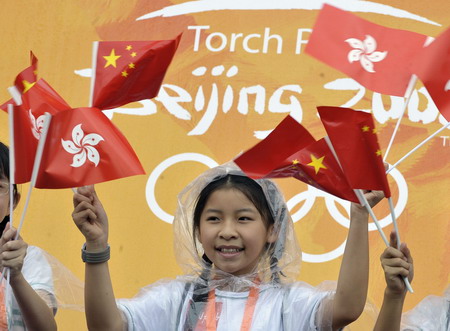 Children wave Hong Kong and Chinese flags during the start of the Olympic torch relay in Hong Kong May 2, 2008. The Olympic flame was paraded through Hong Kong on Friday to a largely welcoming public during its first leg on Chinese soil. [Agencies]