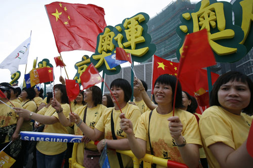 Macao residents wave Chinese flags and Macao SAR flags as they watch the 2008 Beijing Olympic torch relay in Macao May 3, 2008. [Agencies]]