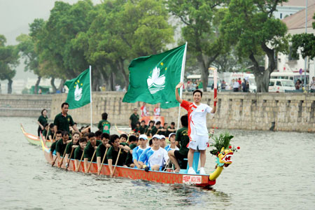 Pang Tsz Shan, a Macao athlete holding the Olympic torch, rides a dragon boat during the Beijing Olympic torch relay in Macao May 3, 2008. Macao is the 21st stop of the Olympic torch relay, and after the relay in the island city, the sacred flame will be delivered to the first stop in the Chinese mainland -- Sanya in Hainan Province. [Xinhua]