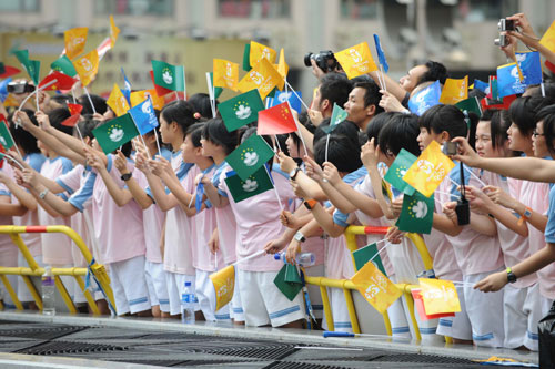 Macao residents wave Chinese flags and Macao SAR flags as they watch the 2008 Beijing Olympic torch relay in Macao May 3, 2008. [Xinhua]
