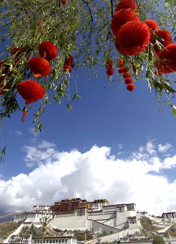 Red lanterns are hung in front of the Potala Palace to celebrate the successful arrival of the Olympic torch on the peak of Mt. Qomolangma on Thursday morning. [Xinhua]