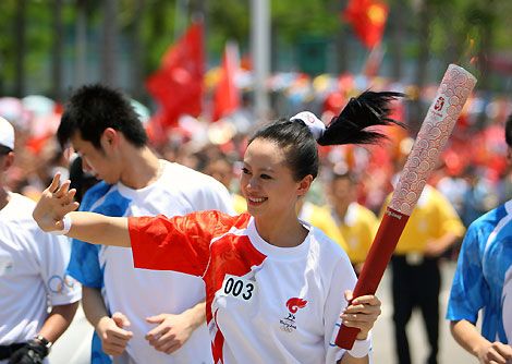 Gymnast Dai Feifei waives while running a leg of the Olympic torch relay in Shenzhen in southern China's Guangdong province May 8, 2008. On the same day, the Olympic flame for the first time in history reached the top of the world, Mount Qomolangma at 8,8844 meter. [Xinhua]