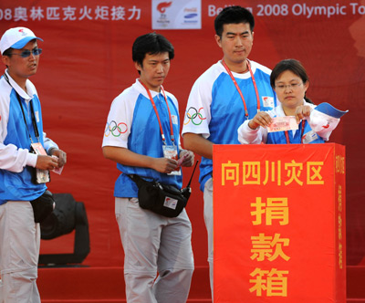 Torch relay staff members line up to put money into a donation box while attending an event to contribute to quake-hit areas in Longyan, East China's Fujian Province, May 13, 2008. The Olympic torch relay continued its planned route in Fujian Province on Tuesday after a 7.8 magnitude earthquake jolted Southwest China's Sichuan Province Monday, leaving nearly 12,000 dead. [Xinhua]