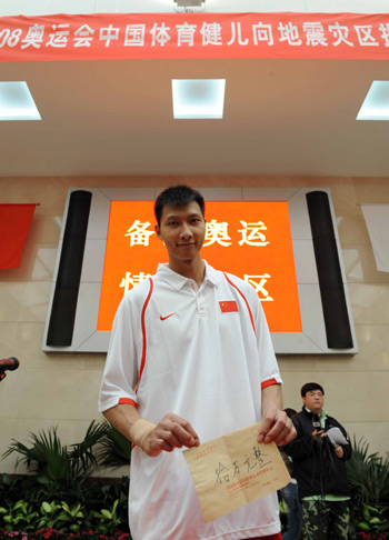 China's NBA star Yi Jianlian donates 100,000 yuan to quake-hit areas in Beijing, May 14, 2008. About 500 athlets and coaches, who are training in Beijing for the upcoming Olympic Games, attended the disaster-relief event after a 7.8 magnitude earthquake jolted Southwest China's Sichuan Province Monday, leaving nearly 14,866 dead by 2pm Wednesday. [Xinhua].