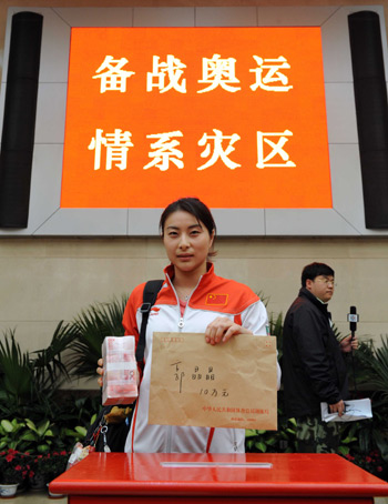 Chinese diving queen Guo Jingjing donates 100,000 yuan to quake-hit areas in Beijing, May 14, 2008. About 500 athlets and coaches, who are training in Beijing for the upcoming Olympic Games, attended the disaster-relief event after a 7.8 magnitude earthquake jolted Southwest China's Sichuan Province Monday, leaving nearly 14,866 dead by 2pm Wednesday. [Xinhua].
