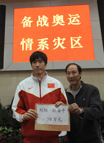Athens Olympics 110m hurdles winner Liu Xiang and his coach Sun Haiping jointly donate 500,000 yuan (US$71,000)to quake-hit areas in Beijing, May 14, 2008. About 500 athlets and coaches, who are training in Beijing for the upcoming Olympic Games, attended the disaster-relief event after a 7.8 magnitude earthquake jolted Southwest China's Sichuan Province Monday, leaving nearly 14,866 dead by 2pm Wednesday. [Xinhua]