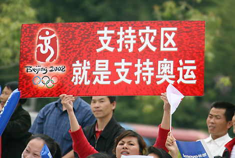 Local residents hold up a banner that reads, "Supporing Quake-hit Areas Equals to Supporting the Olympic Games" while watching the Beijing Olympic torch relay in Jinggangshan, East China's Jiangxi Province, May 15, 2008. [Xinhua] |