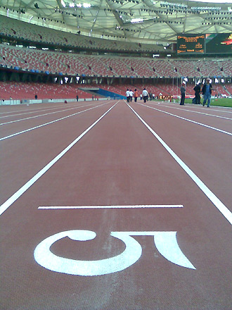 This picture taken on May 22, 2008 shows the No. 5 track inside the National Stadium. Chinese Olympic champion hurdler Liu Xiang will run on this track during the semifinals of the "Good Luck Beijing" China Athletics Open on Friday night, according to the Xinhua News Agency. [China Daily]