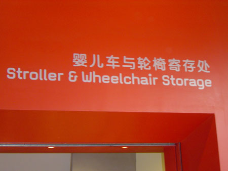 A picture taken on May 22, 2008 shows a sign reading "stroller and wheelchair storage" in the National Olympic Stadium, also known as the Bird's Nest in Beijing. [chinadaily.com.cn]