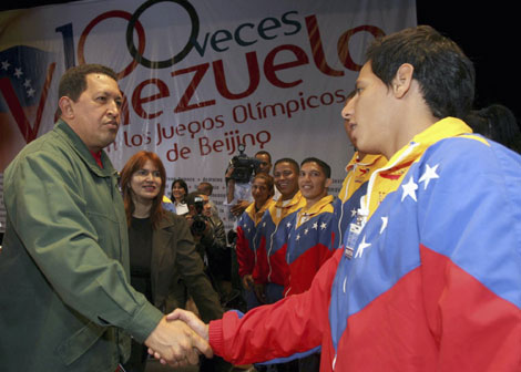 Venezuelan President Hugo Chavez (L) shakes hands with an athlete during an event with the sport delegation which will take part at the 2008 Beijing Olympic Games in Caracas, May 26, 2008. During the event, President Chavez announced that there will be 100 Venezuelan athletes taking part in the 2008 Beijing Olympics. [Agencies] |