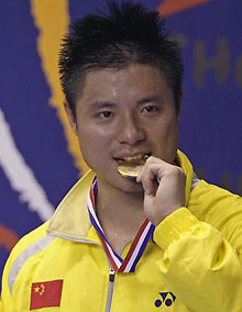Xie Zhongbo holds the gold medals during a ceremony after China beat South Korea during the Thomas Cup badminton tournament in Jakarta May 18, 2008. [Agencies]