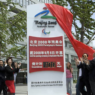 The Beijing Paralympics Countdown Signboard is unveiled on the 100-day countdown to the Beijing Paralympic Games, May 29, 2008.[Xinhua]