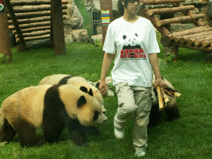 A feeder leads pandas at the enclosure in the Beijing Zoo on June 5, 2008. [Wang Yi/ Chinadaily.com.cn]