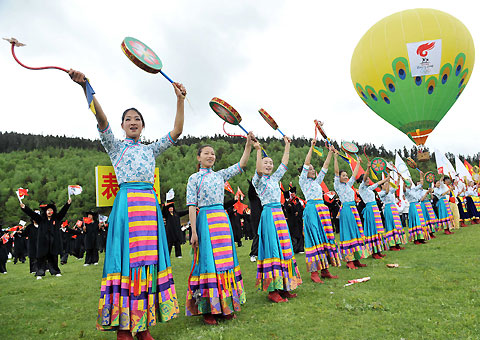 Local residents in ethnic dress in Shangri-La, southwest Yunnan Province welcome the Olympic torch. The Yunnan leg of the relay completed yesterday and the torch now heads to Guizhou Province. [Xinhua]