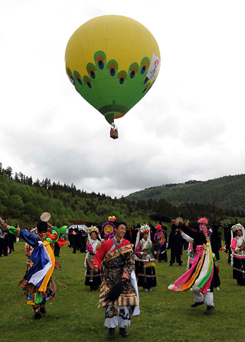 Local residents in ethnic dress in Shangri-La, southwest Yunnan Province welcome the Olympic torch. [Xinhua]