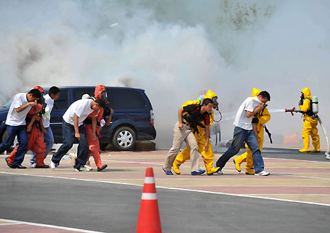 Spectators are evacuated after a chemical attack during the "Great Wall V" anti-terrorist exercise at the Chaoyang Park in Beijing, June 11, 2008. [Xinhua]