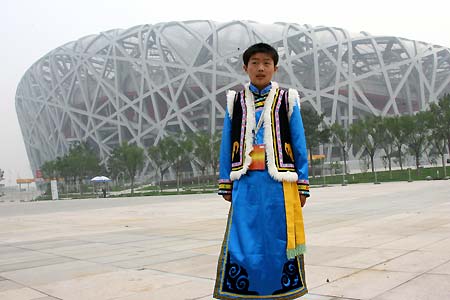 14-year-old Li Pan, from the Qiang ethnic minority, poses in front of the National Stadium, or "Bird's Nest", June 19, 2008. Fifty-six ambassadors of China's 56 ethnic groups, most with a physical disability, will enjoy the host city in a five-day "Olympic Tour" event until June 23. [Xinhua]