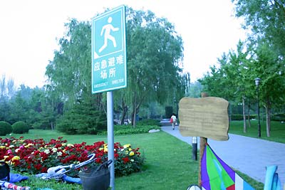 A sign for emergency shelters is seen inside Yuandadu Park, June 19, 2008. As a pilot project for China's emergency shelters, Yuandadu Park became a model for the capital's other 31 shelters. [chinadaily.com.cn]