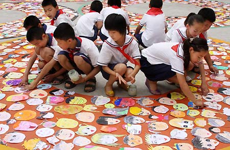 Students glue drawings of their "smiling faces" to a large image of the five Olympic rings on a school playground in Huaibei, Anhui Province, June 22, as part of Olympic Day celebrations. Monday marks the Olympic Day – the day the International Olympic Committee was founded. [Xinhua]