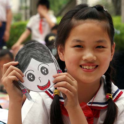 A girl shows a drawing of her "smiling face" at a school playground in Huaibei, Anhui Province, June 22, 2008, as part of Olympic Day celebrations. Monday marks Olympic Day – the day the International Olympic Committee was founded in 1894. [Xinhua]
