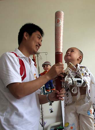 Three-year-old Lang Zheng (R), an earthquake survivor who became an overnight celebrity for a picture of him on a stretcher raising his hand in salute to quake-relief PLA soldiers, holds the Beijing 2008 Olympic torch at a ward in Xi'an, capital of Shaanxi Province, June 23, 2008. Torchbearer Wang Zhen (L) visited Lang Monday. [Xinhua]